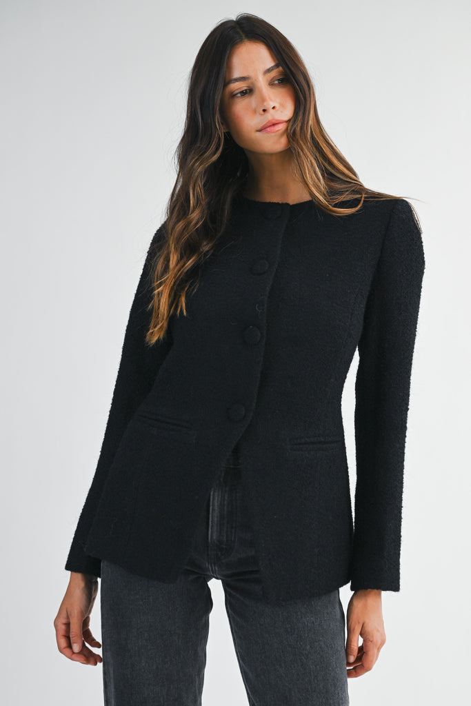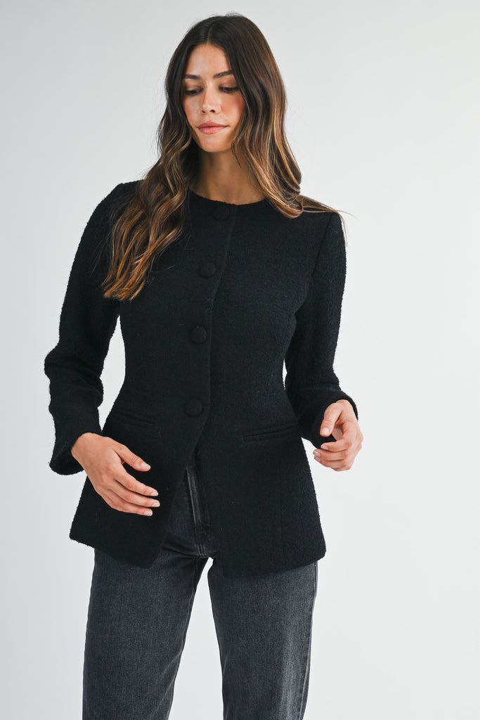 Saco de corte recto y entallado, que define la silueta de manera sutil. Tiene mangas largas y cuello redondo sin solapa, lo que le da una apariencia moderna y minimalista. El cierre es frontal con botones forrados en la misma tela, creando un acabado limpio y armonioso. Incluye bolsillos delanteros discretos.