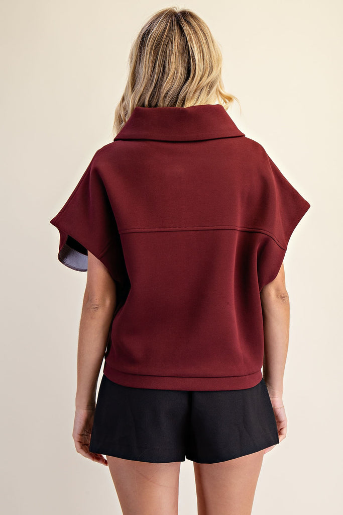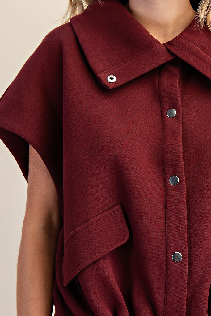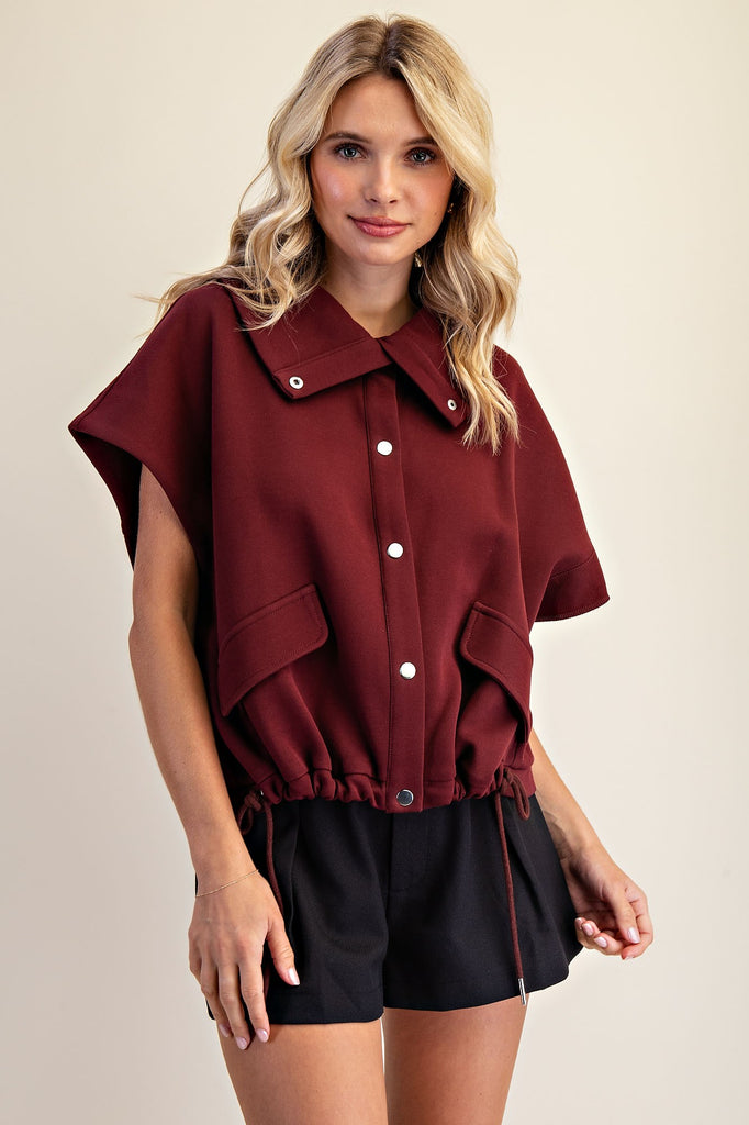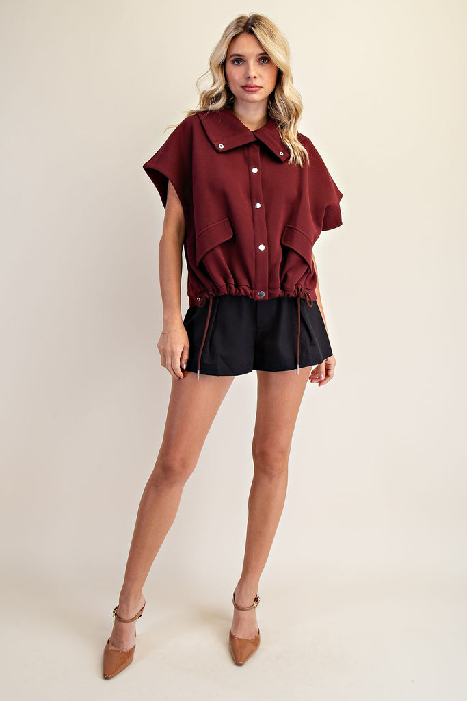Diseño: Chaleco o chaqueta corta de estilo casual-urbano. Se caracteriza por su corte boxy (cuadrado) y mangas cortas muy anchas o tipo murciélago. Presenta un cuello camisero con botones a presión decorativos en las puntas. El cierre frontal es con botones a presión visibles. Incluye dos grandes bolsillos de parche con solapa a la altura de la cintura. La cintura es ajustable mediante un cordón o jareta que frunce el tejido, creando un bajo tipo bomber o ajustado, que le da forma y define la silueta sobre la cadera.